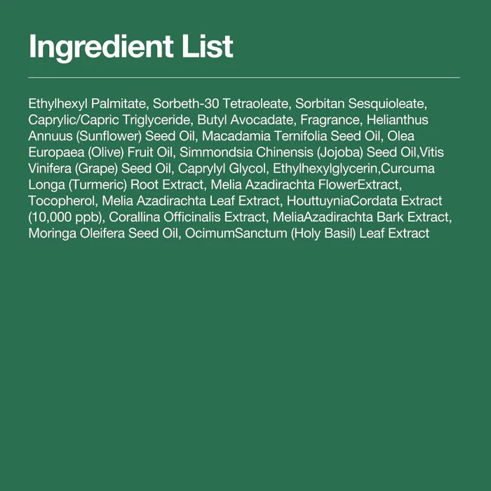 Ethylhexyl Palmitate, Sorbeth-30 Tetraoleate, Sorbitan Sesquioleate, Caprylic/Capric Triglyceride, Butyl Avocadate, Parfum (Fragrance), Helianthus Annuus (Sunflower) Seed Oil, Macadamia Ternifolia Seed Oil, Olea Europaea (Olive) Fruit Oil, Simmondsia Chinensis (Jojoba) Seed Oil, Vitis Vinifera (Grape) Seed Oil, Caprylyl Glycol, Ethylhexylglycerin, Curcuma Longa (Turmeric) Root Extract, Melia Azadirachta Flower Extract, Tocopherol, Melia Azadirachta Leaf Extract, Houttuynia Cordata Extract, Corallina Officinalis Extract, Melia Azadirachta Bark Extract, Moringa Oleifera Seed Oil, Ocimum Sanctum Leaf Extract