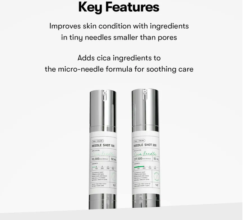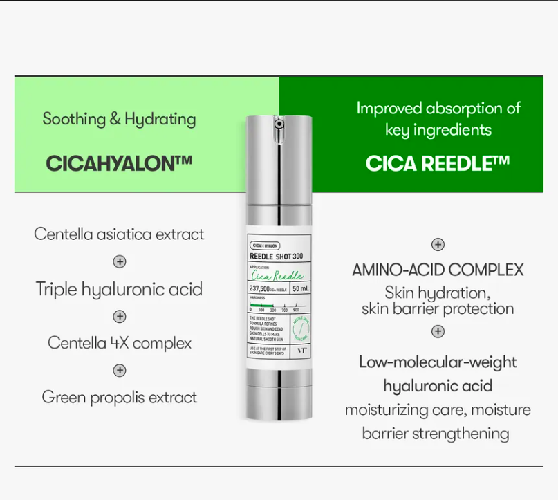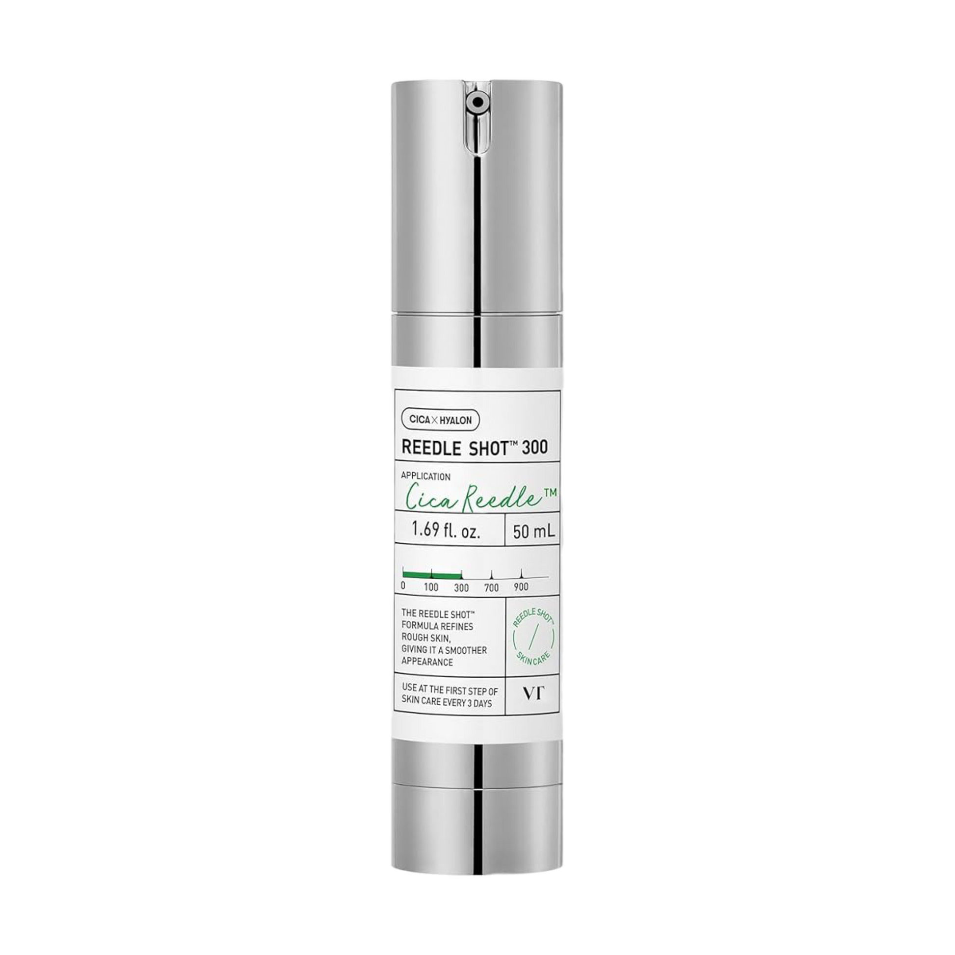 The VT Reedle Shot 300 is an intensive skin-revitalizing treatment packed with high-dose Cica reedles that deeply stimulate the skin to improve texture, firmness, and clarity—ideal for experienced users seeking visible, transformative results. This Reedle shot skin booster softens rough skin, minimizes pore size, and removes dead skin cells. This hypoallergenic skin treatment is infused with centella asiatica extract and hyaluronic acid to replenish moisture deep within skin and strengthen the skin barrier for a soft and hydrated finish. Niacinamide and madecassoside in the mix provide antioxidant and anti-inflammatory properties. It gently exfoliates away dead skin cells for smooth skin. Suitable for all skin types including sensitive skin.