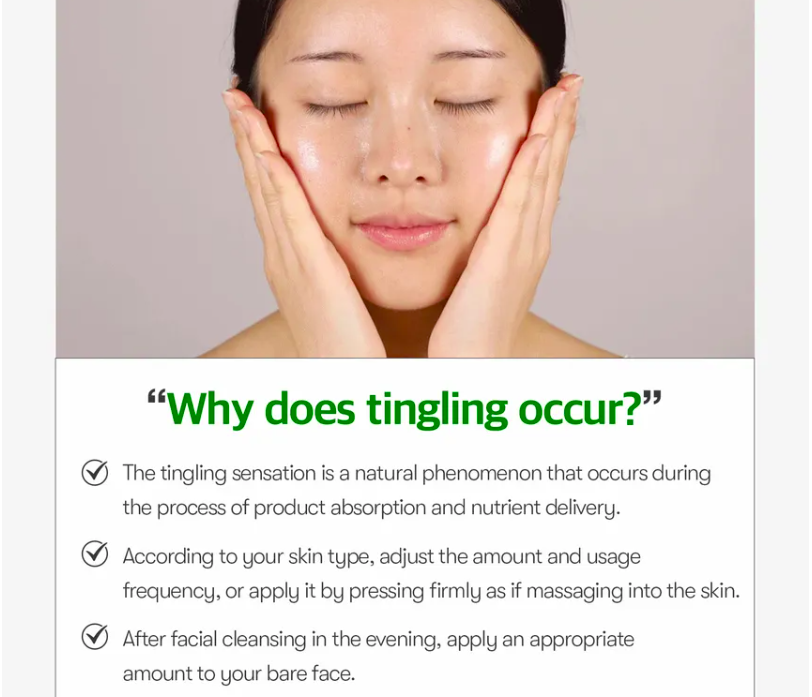 The tingling sensation upon application is a natural occurrence as the product absorbs and delivers nutrients to your skin. Be sure to read the "How to Use" section thoroughly for important usage instructions.